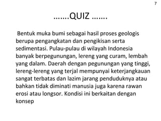 22 Bentuk Muka Bumi Yang Dihasilkan Oleh Tenaga Endogen. Beberapa bentuk permukaan Bumi ini diantaranya adalah perairan dan daratan baca. Kedudukan Malaysia ialah antara garis lintang 1U hingga 7U dan menganjur dari garis bujur 100T hingga 120T.
